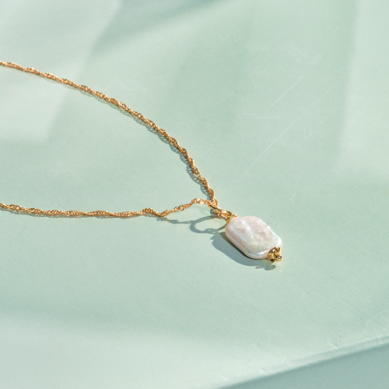 Materiale: Halskæde: 18 karat guldbelagt stål. Vedhæng: Ferskvandsperle.