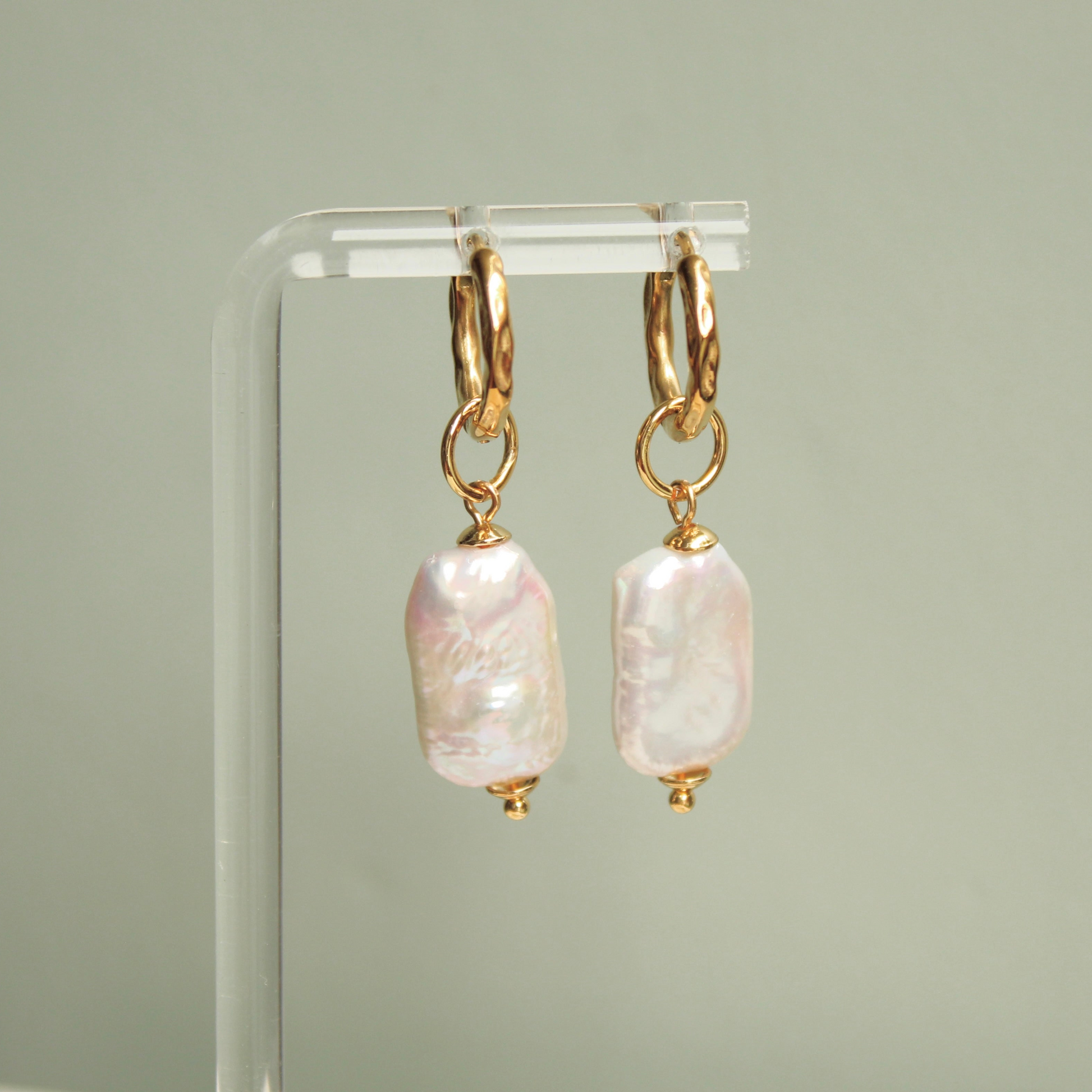 Materiale: Øreringe: 18 karat forgyldt stål. Vedhæng: Ferskvandsperle.
