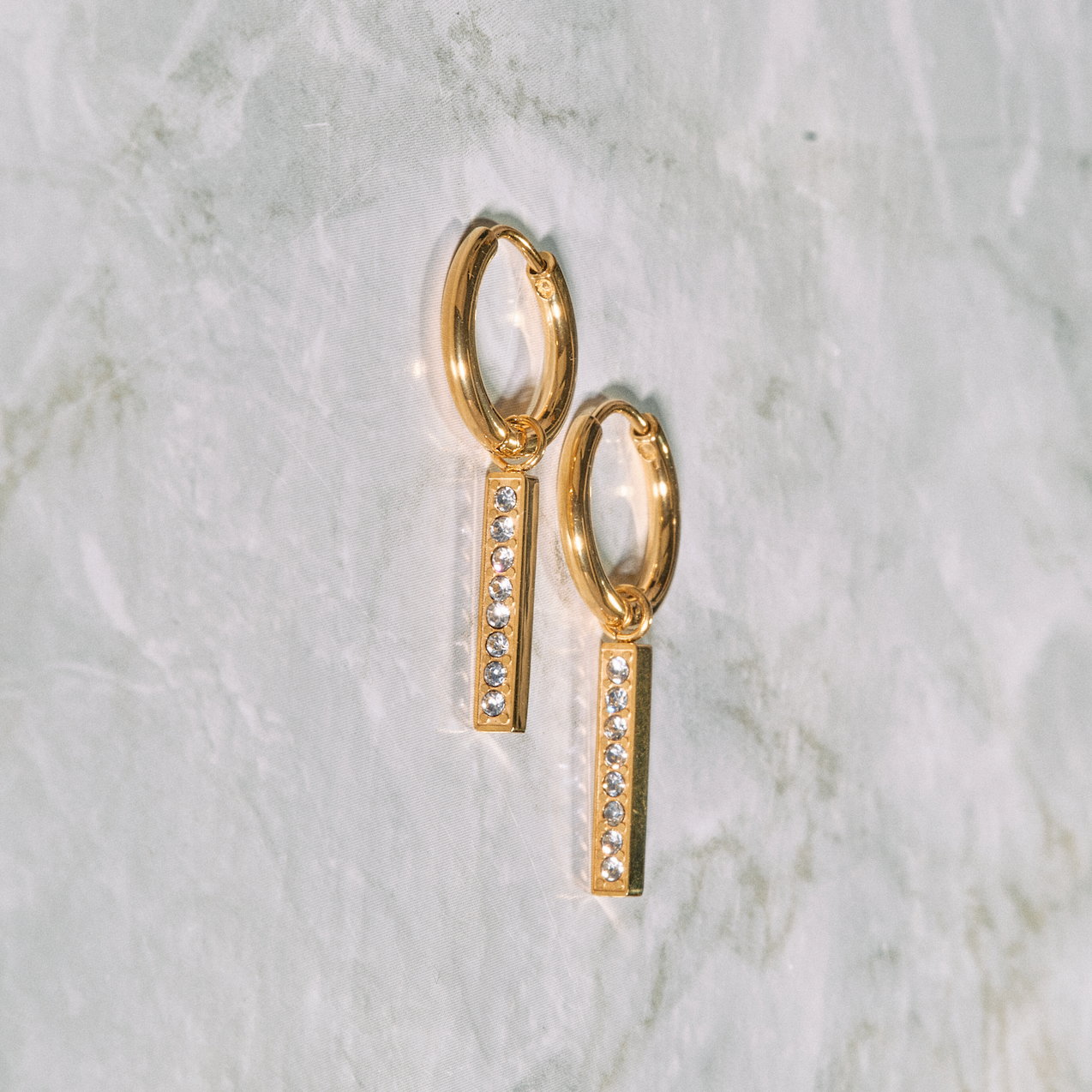 Elegante creolere med en pendant bestående af otte skønne zirkoniasten på langs, som skinner smukt og er 18 karat forgyldt.