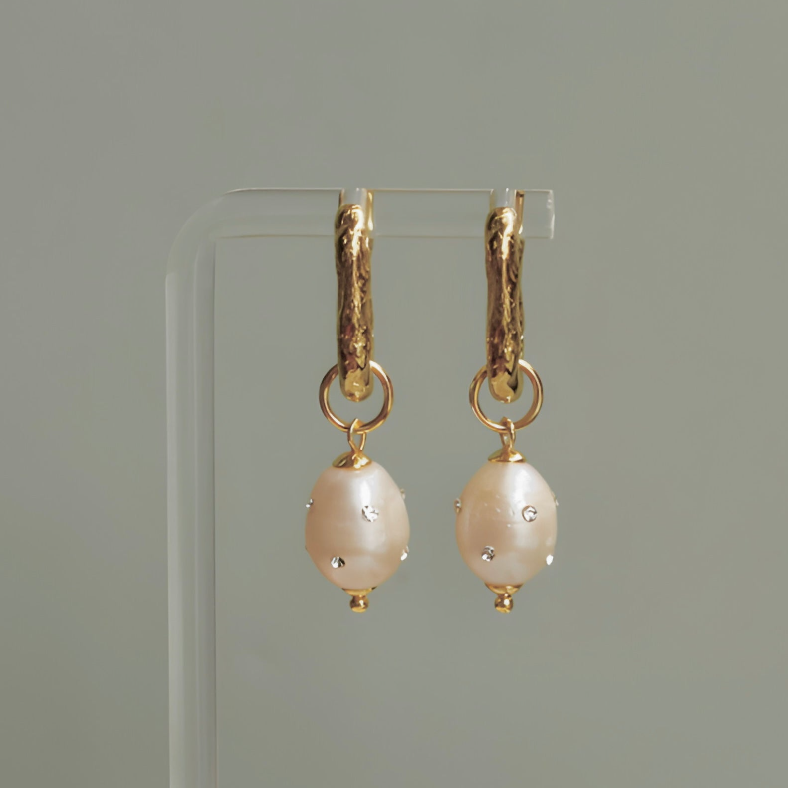 Materiale: Øreringe: 18 karat forgyldt stål. Vedhæng: Ferskvandsperle m. zirkonædelsten.