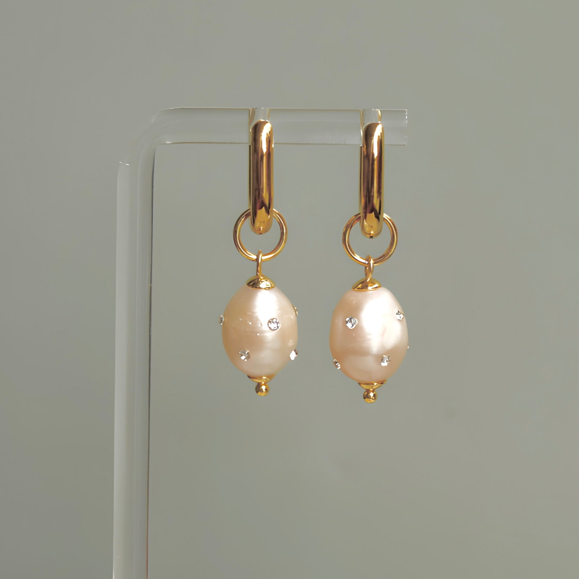Materiale: Øreringe: 18 karat forgyldt stål. Vedhæng: Ferskvandsperle m. zirkonædelsten.